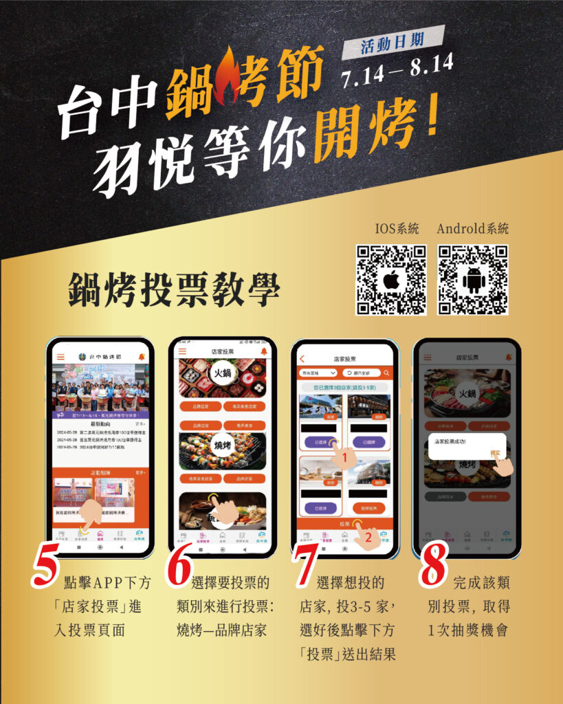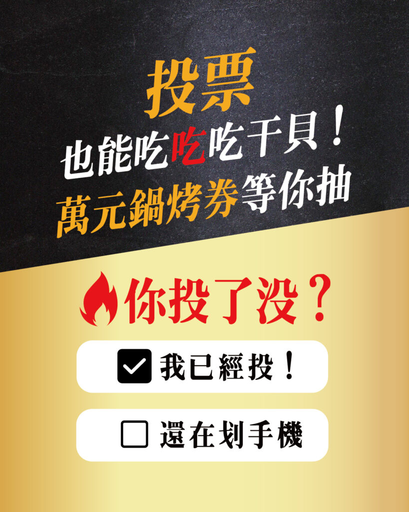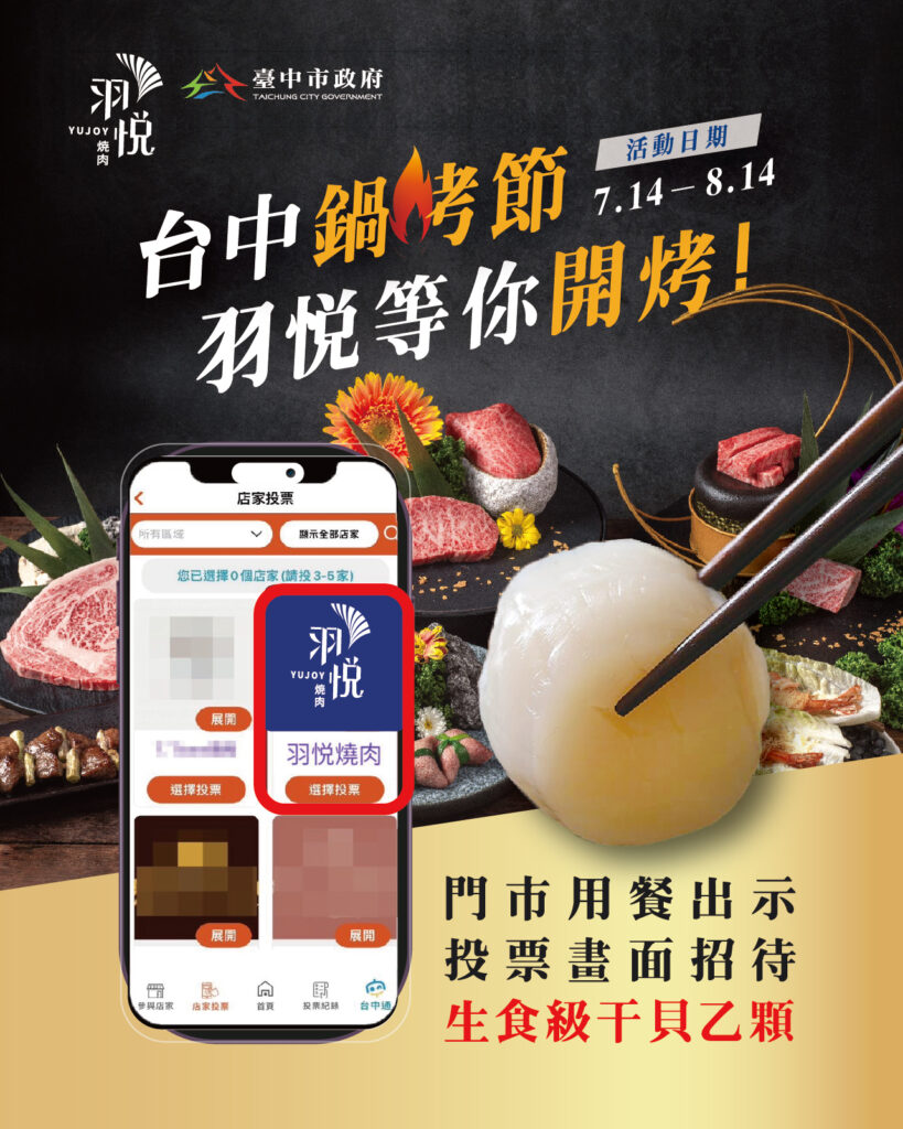 台中鍋烤節‧投票送干貝!還抽萬元鍋烤券 Play Pause Unmute Mute 台中鍋烤節 羽悅開烤啦! 一年一度投票活動開跑~ 現在幫 羽悅燒肉投票 直接送你一顆「日本生食級干貝」! 還能抽 萬元鍋烤券,吃爽爽! 還加碼抽汽車跟機票 怎麼投?: 打開《台中通APP》→台中鍋烤節 點「鍋烤品牌店家」→ 找 羽悅燒肉 投下你神聖又飢餓的一票! 活動時間:7/14 ~ 8/14 投票就送干貝一顆+抽萬元鍋烤券! 羽悅滿一歲了,謝謝每一位吃過、分享過、回來過的你。 你的每句「好吃」、每次支持,都是我們持續努力的理由。 快來幫羽悅撐腰! #羽悦燒肉 #鍋烤節 #台中鍋烤節 #投票送干貝 #萬元鍋烤券 #台中通APP #燒肉控集結 #台中燒肉 #公益路美食 #和牛 #抽獎